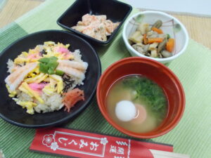 昼食 ちらし寿司 筑前煮 根菜のまさご和え お雑煮(白みそ)