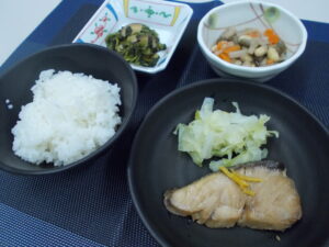 夕食 ご飯 ぶりの幽庵焼き 大豆煮 ほうれん草のポン酢和え