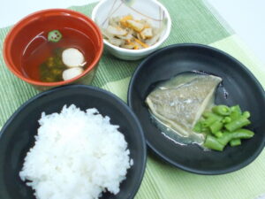 昼食 ご飯 カレイの味噌煮 金平ごぼう 清汁(オクラ・麩)