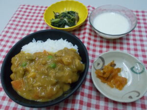 昼食 シーフードカレー 小松菜のドレッシング和え フルーツヨーグルト