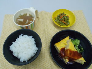 昼食 ご飯 スパニッシュオムレツ アスパラサラダ コンソメスープ