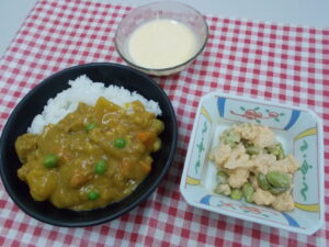 昼食 チキンカレー 枝豆とカリフラワーのサラダ みかんヨーグルト