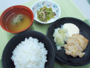 昼食 ご飯 チキン南蛮 ピーナッツ和え みそ汁(玉葱・ねぎ)