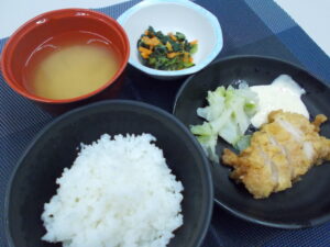 昼食 ご飯 チキン南蛮 チンゲン菜の和え物 みそ汁(玉葱・いんげん)