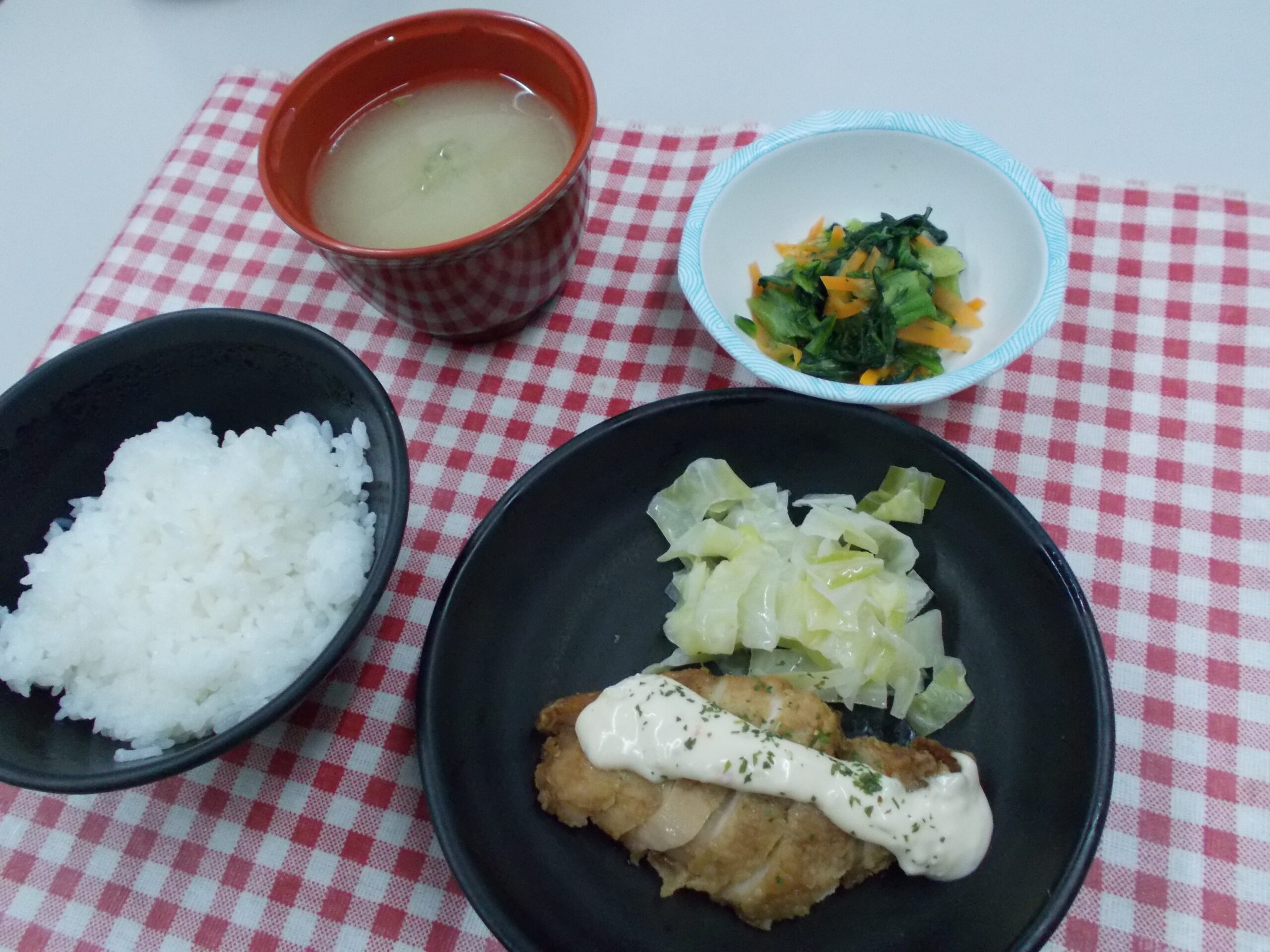 昼食 ご飯 チキン南蛮 チンゲン菜の和え物 みそ汁(玉葱・ねぎ)