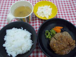 2025年9月30日 / 最終更新日 : 2025年10月1日 yorokobien 昼食 昼食 ハンバーグのきのこデミグラスソース 昼食 ご飯 ハンバーグのきのこデミグラスソース マカロニサラダ コンソメスープ