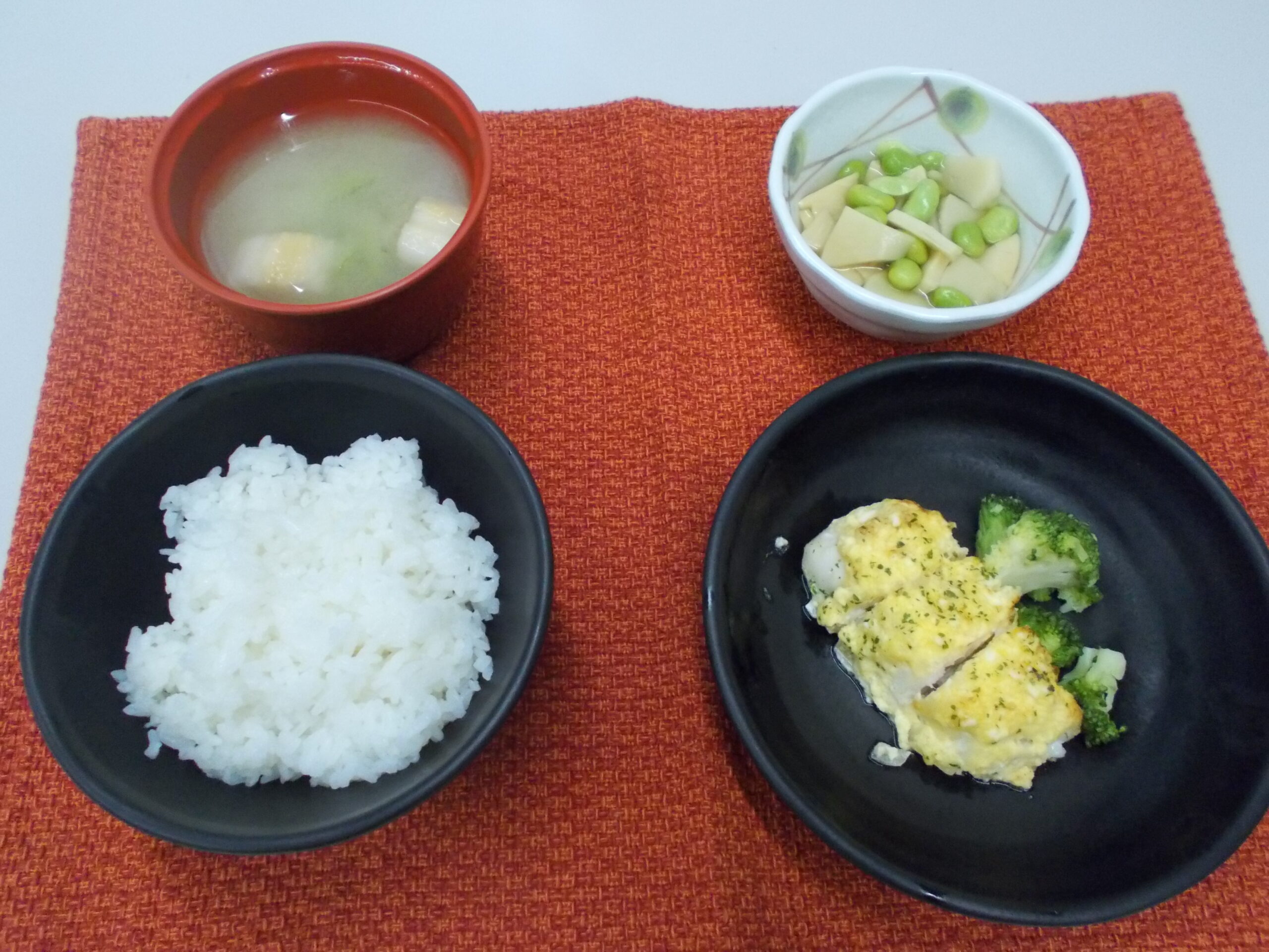 昼食 ご飯 メルルーサのミモザ焼き 筍と枝豆の薄くず煮 みそ汁(小松菜・麩)