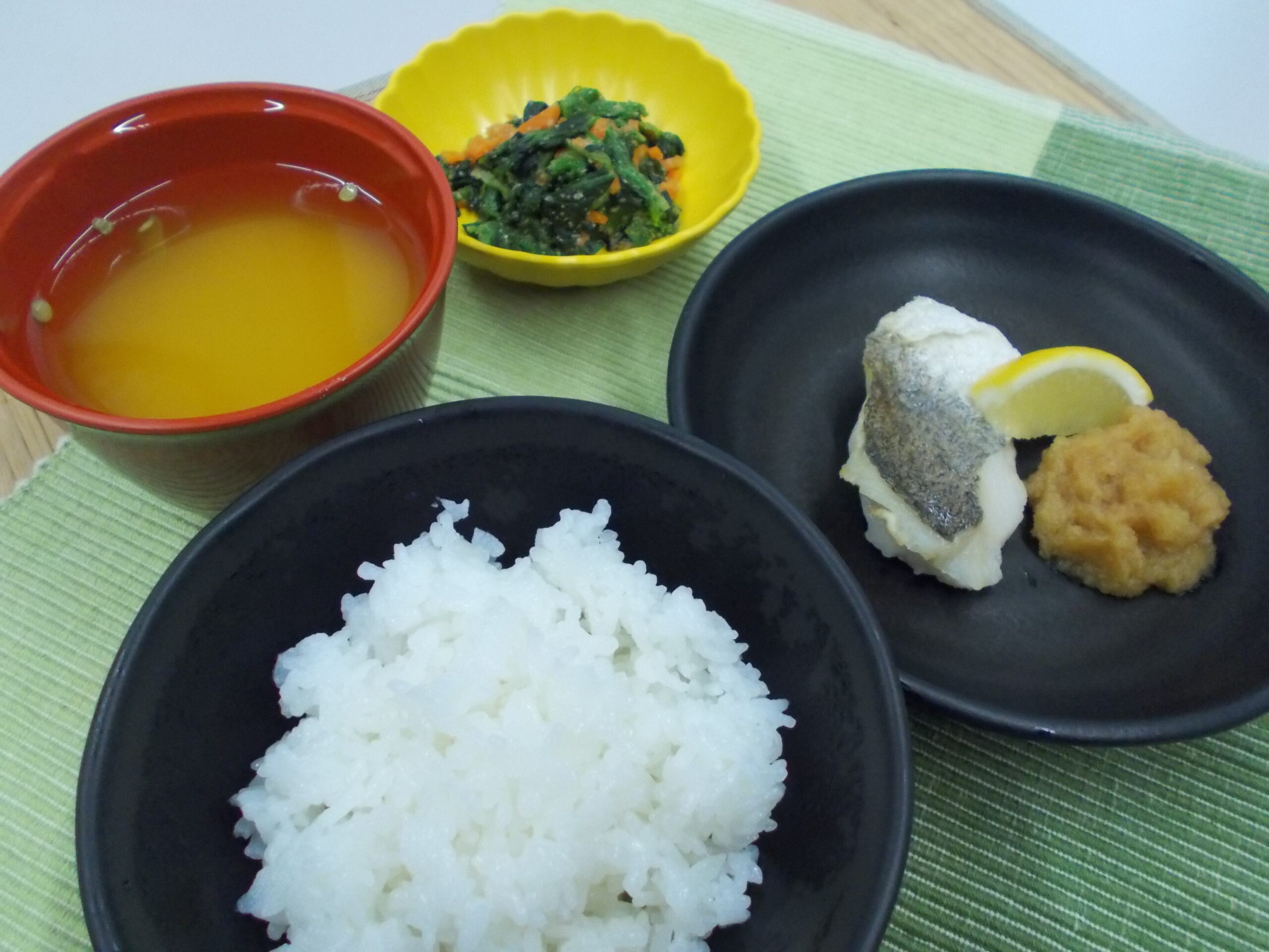 昼食 ご飯 メルルーサの塩焼き ほうれん草のごま和え みそ汁(さつま芋・きぬさや)