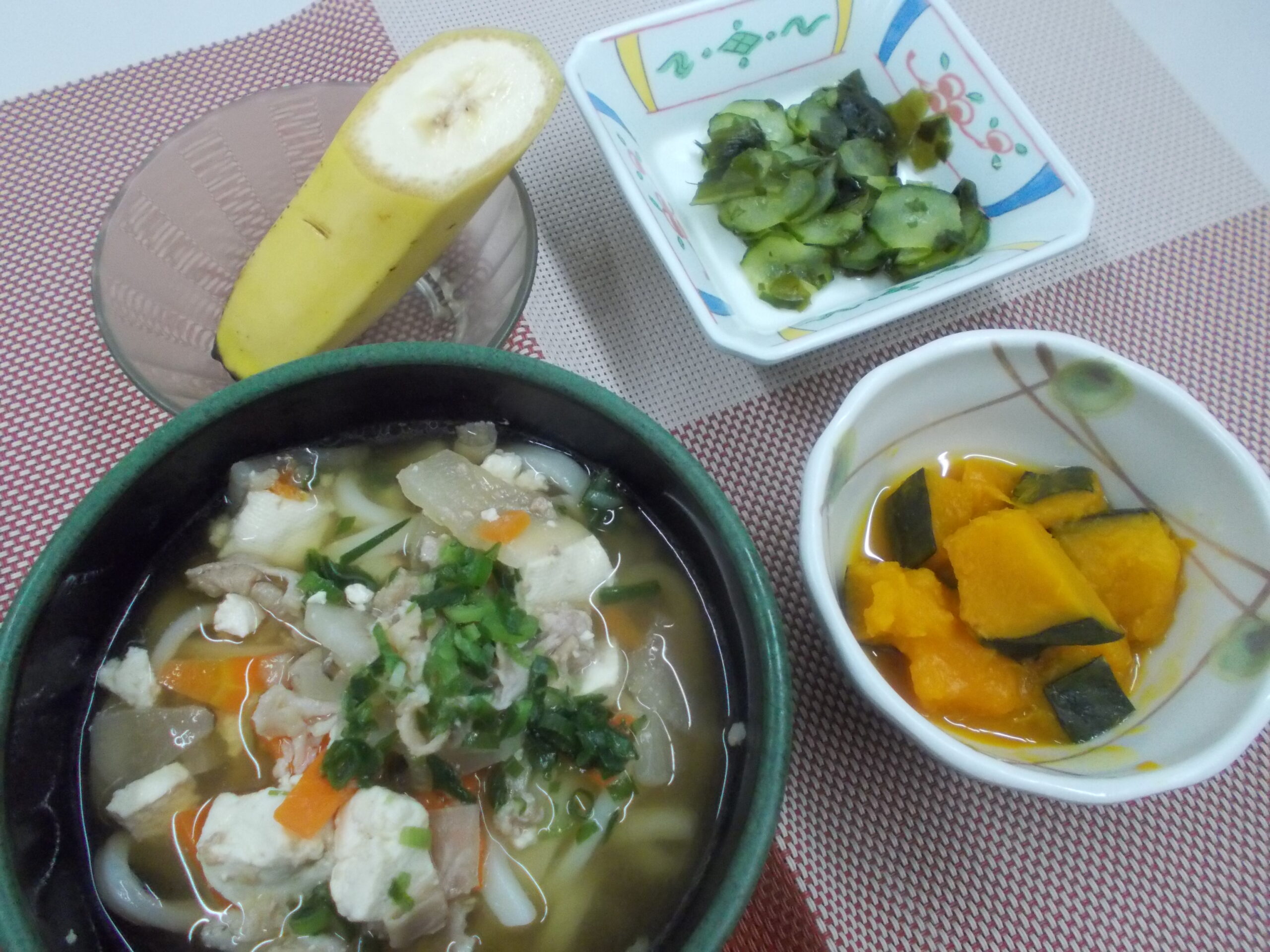 昼食 具だくさんうどん 南瓜の煮物 わかめの酢の物 フルーツ(バナナ)