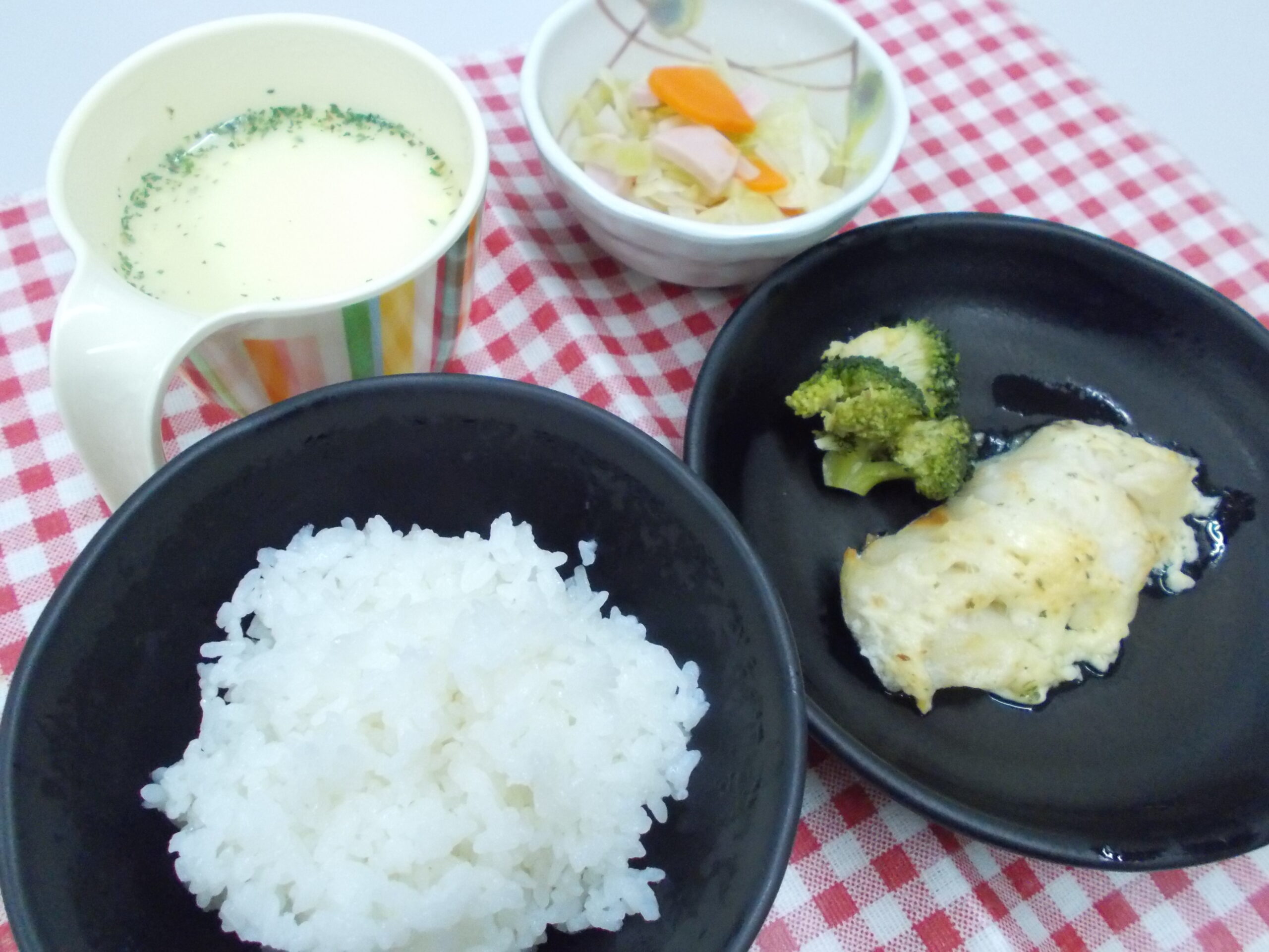 昼食 ご飯 白身魚のマヨネーズ焼き 野菜のコンソメ煮 コーンスープ
