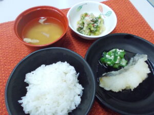 昼食 ご飯 白身魚の揚げだし ブロッコリーとかにかまのサラダ みそ汁(キャベツ・揚げ)