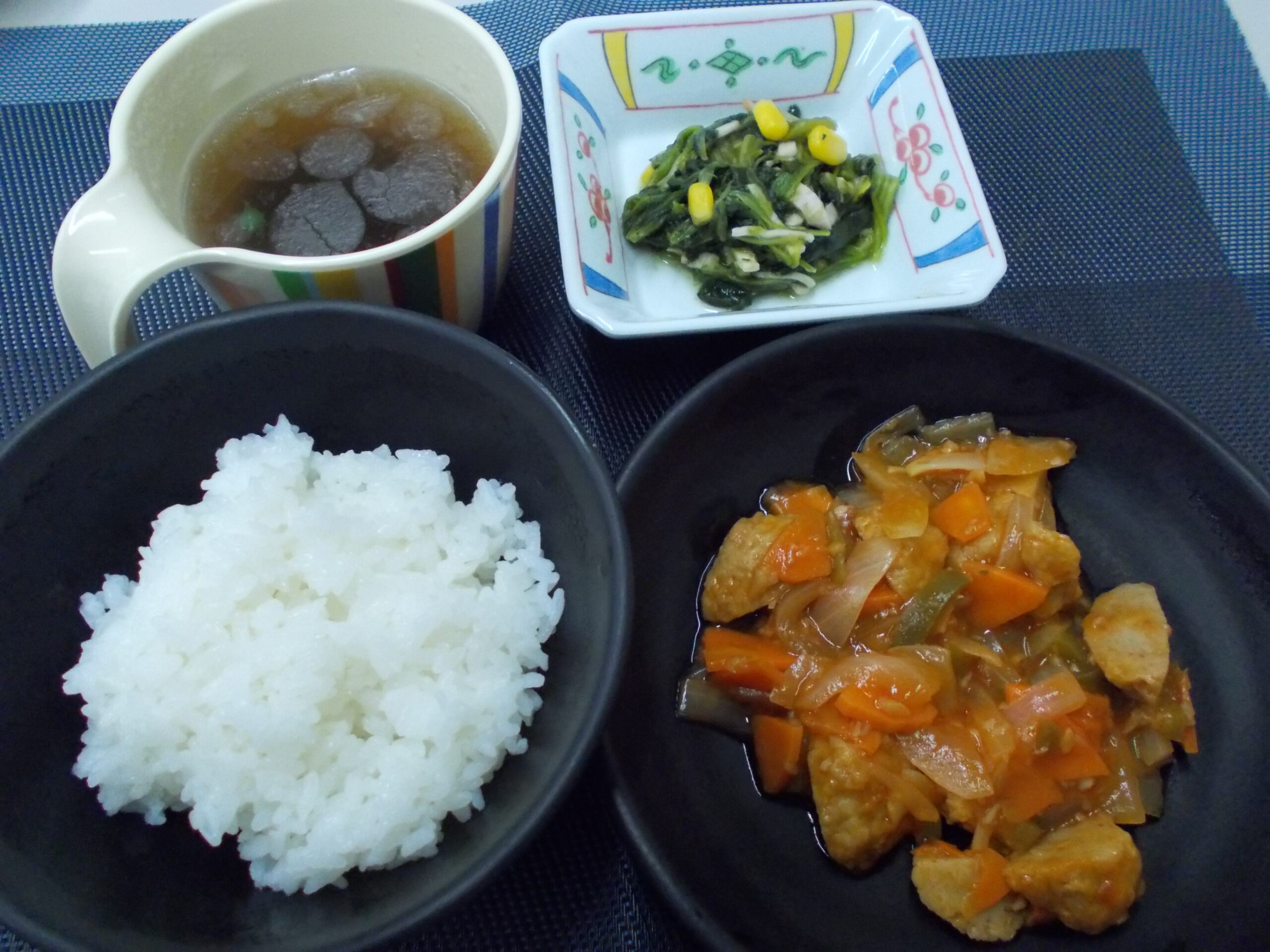 昼食 ご飯 肉団子と野菜の甘酢炒め ほうれん草のドレッシング和え 中華スープ