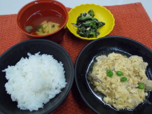 昼食 ご飯 親子煮 菜の花の和え物 清汁(かまぼこ・ねぎ)