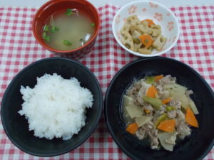 昼食 ご飯 豚肉と大根の生姜煮 蓮根のピリ辛炒め みそ汁(白菜・貝割れ)