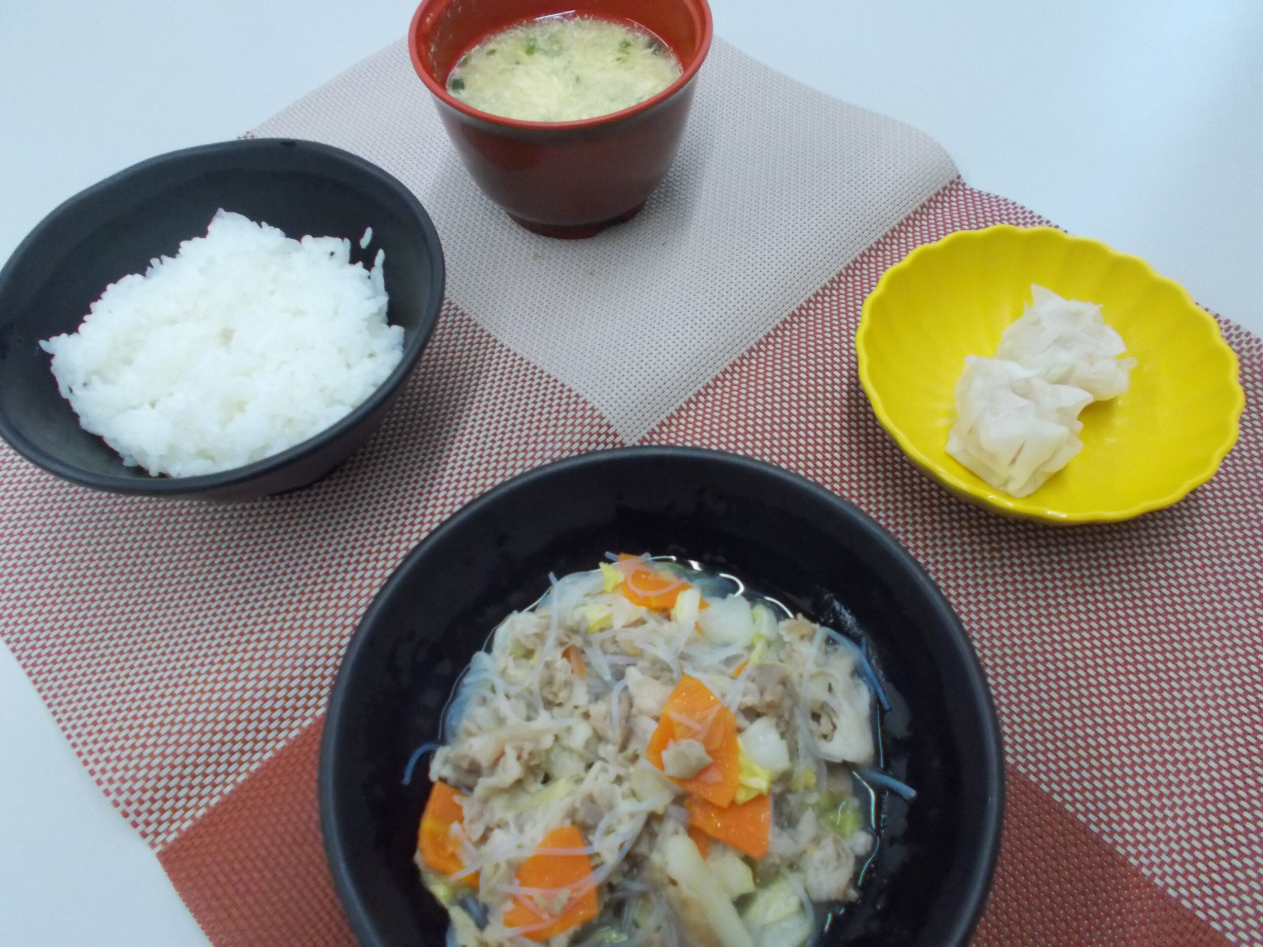 昼食 ご飯 豚肉と春雨の旨煮 焼売 かきたま汁