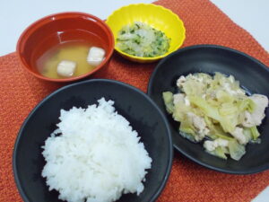 昼食 ご飯 豚肉の生姜炒め 白菜のゆかり和え みそ汁(麩・ねぎ)
