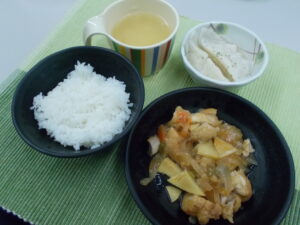 昼食 ご飯 酢鶏 水餃子 かきたまスープ