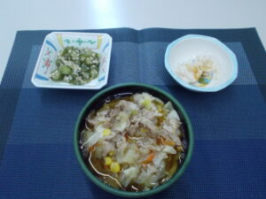 昼食 野菜ラーメン 焼売 オクラのドレッシング和え