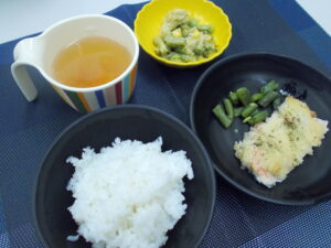 昼食 ご飯 鮭のポテト焼き ブロッコリーサラダ コンソメスープ