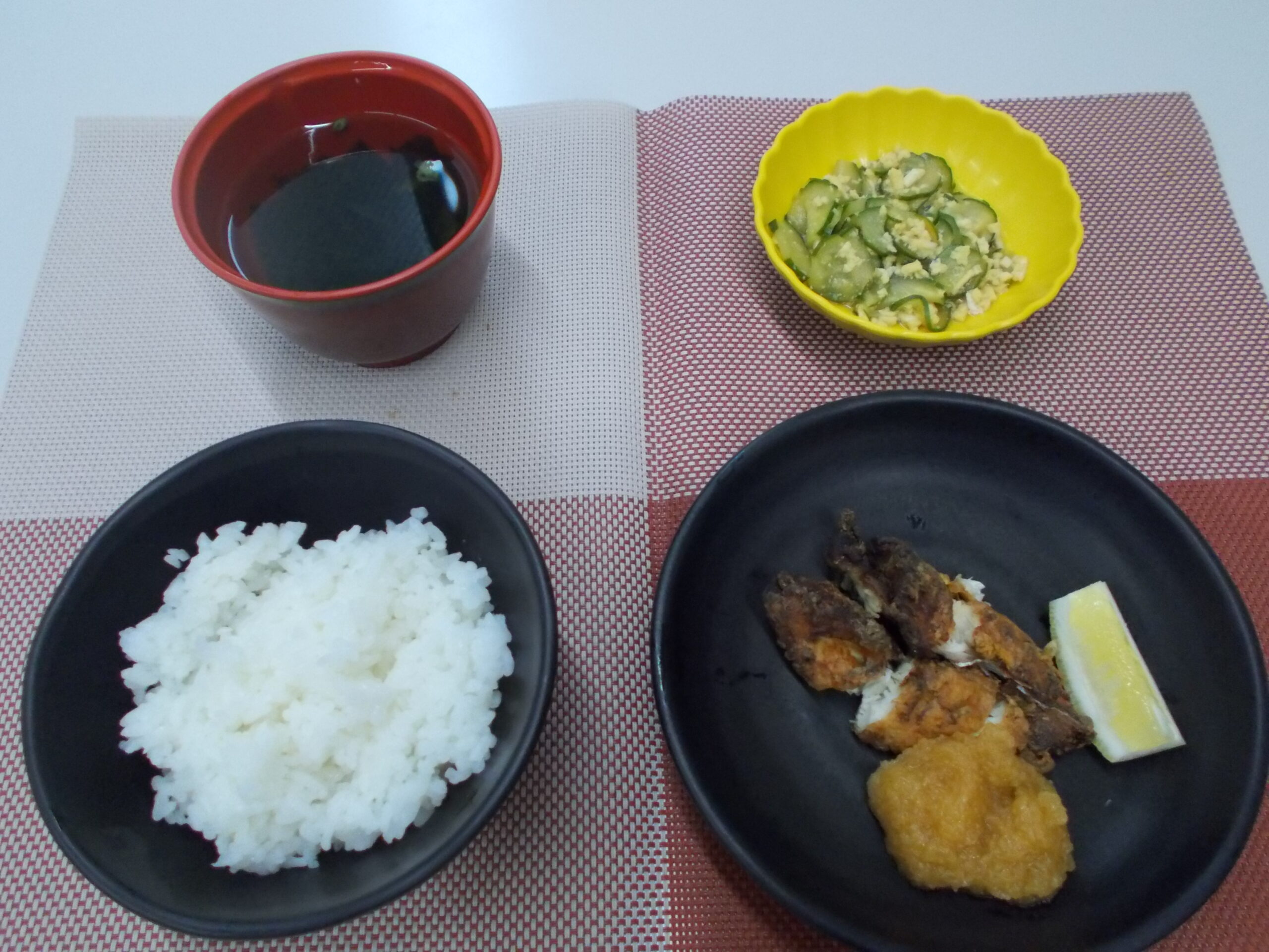 昼食 ご飯 鯖の竜田揚げ 胡瓜のポン酢和え 清汁(わかめ・ねぎ)