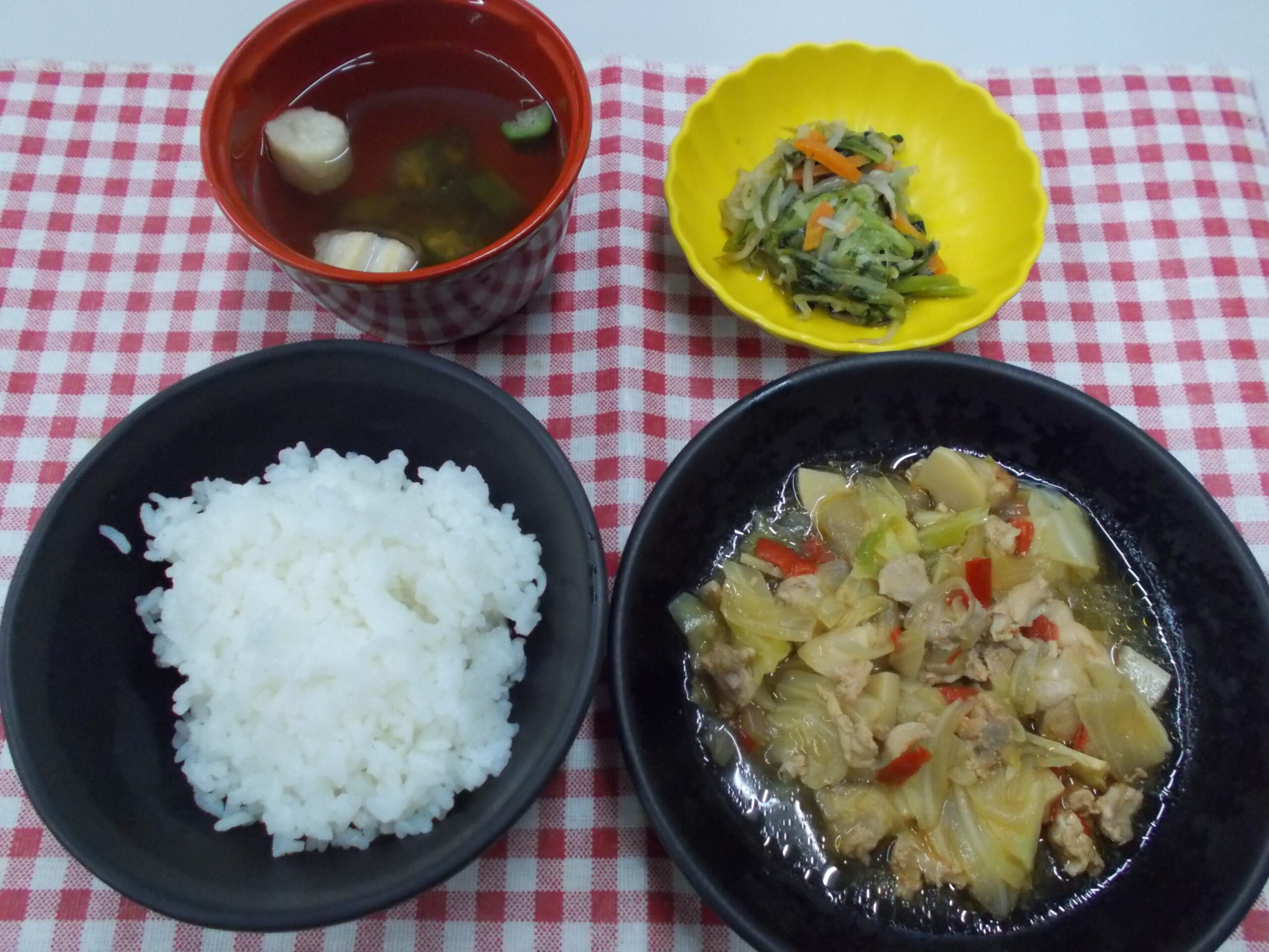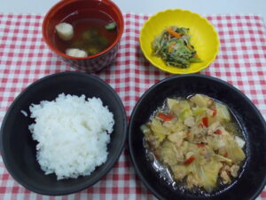 昼食 ご飯 鶏と野菜のオイスター炒め もやしの和え物 清汁(オクラ・麩)