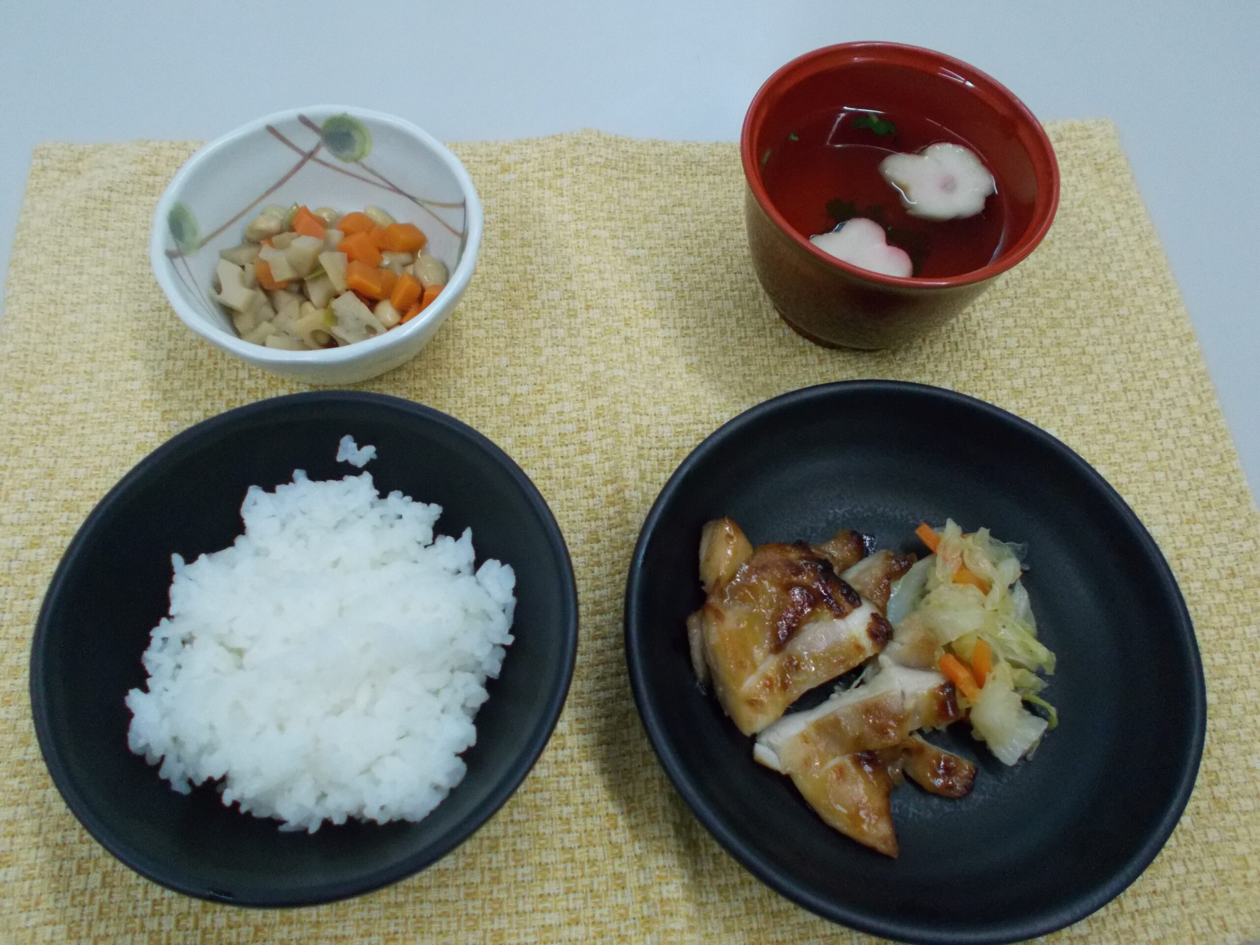 昼食 ご飯 鶏の照り焼き 五目煮 清汁(花麩・三つ葉)