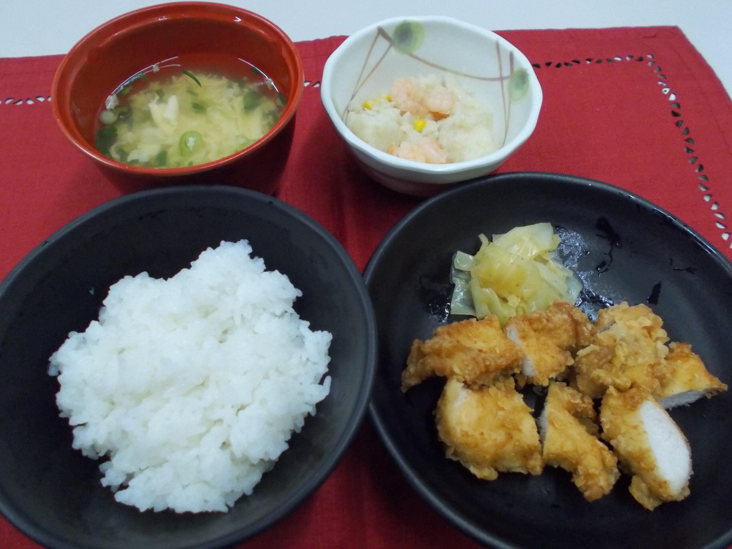 昼食 ご飯 鶏肉のから揚げ 海老とカリフラワーの炒め物 かきたま汁