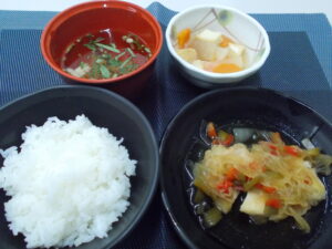 昼食 ご飯 鶏肉の南蛮漬け 大根の煮物 清汁(えのき・三つ葉)