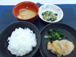 昼食 ご飯 鶏肉の照り焼き きゅうりの酢の物 みそ汁(玉葱・巻麩)
