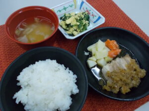 昼食 ご飯 鶏肉の香味ソース ほうれん草と卵のソテー みそ汁(キャベツ・ねぎ)