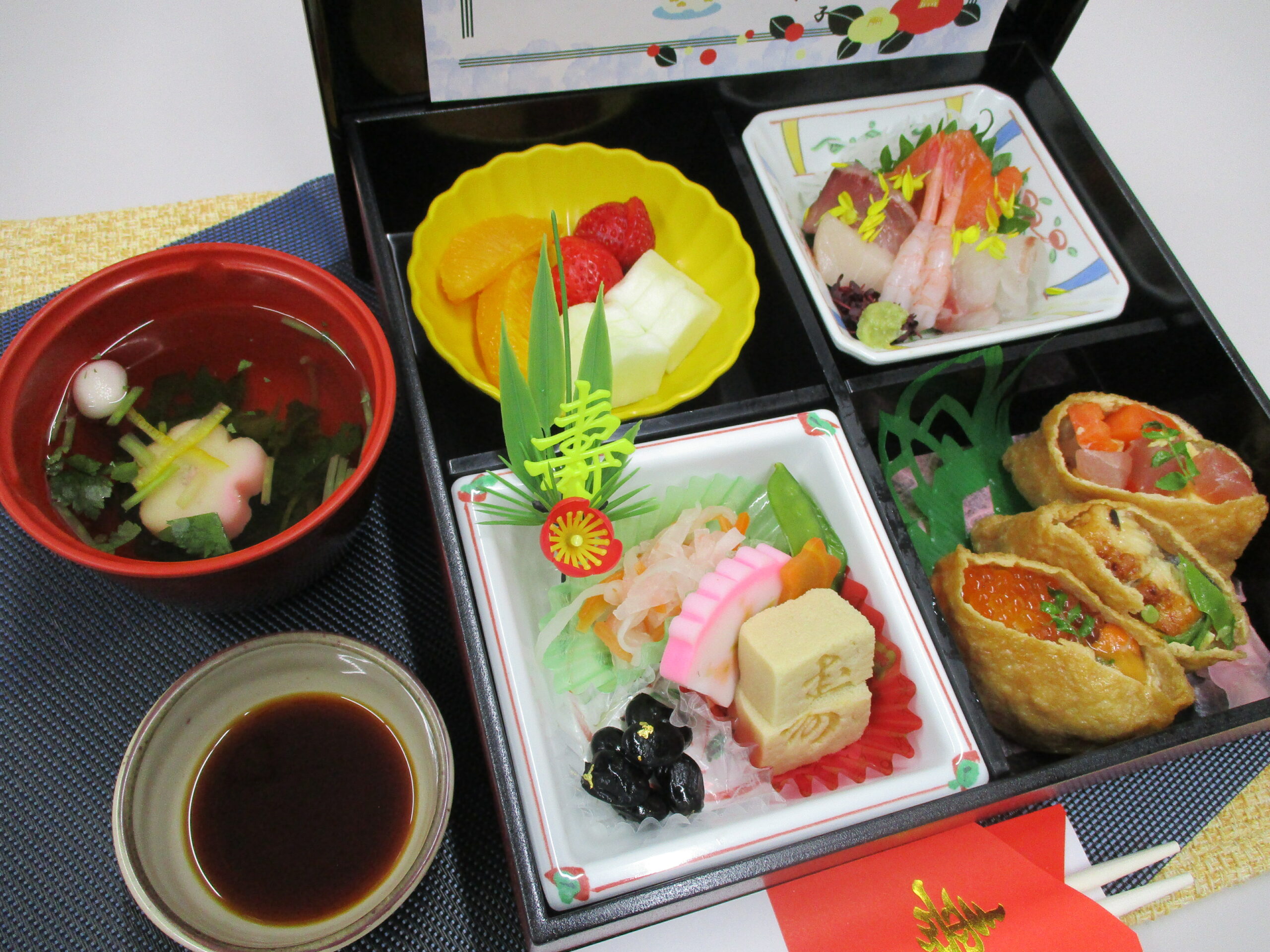 2026年1月1日 / 最終更新日 : 2026年1月2日 yorokobien 昼食 朝昼食 おせち料理 <新年祝賀会> 朝昼食 おせち料理 豪華海鮮いなり寿司(★マグロ・サーモン・玉子 ★鰻・錦糸卵・きぬさや ★うに・イクラ) 煮しめ 紅白なます 黒豆 梅かまぼこ お刺身 フルーツ盛り合わせ 清汁(手毬麩・花麩・ゆず)