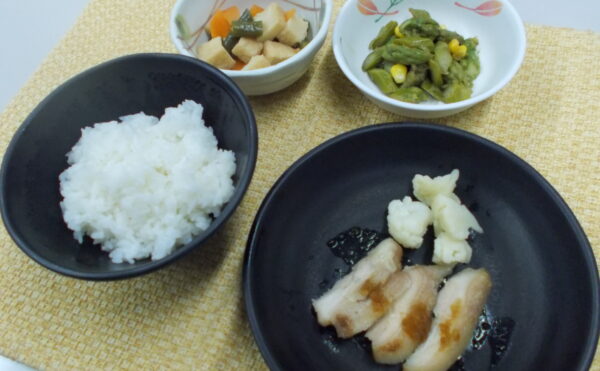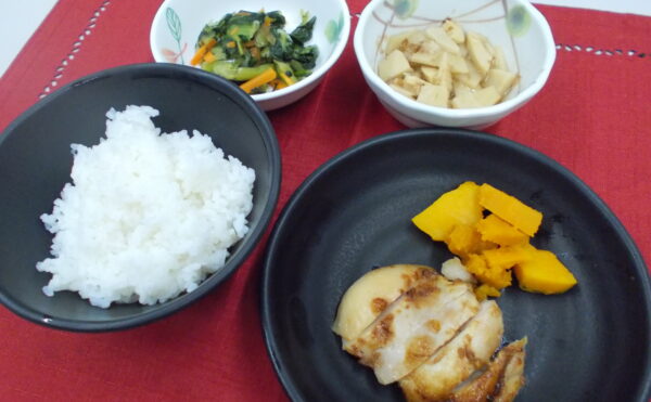 夕食 ご飯 鶏の柚子胡椒焼き たけのこの土佐煮 小松菜の青じそ和え