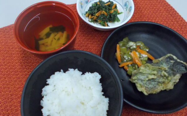昼食 ご飯 アジの磯辺揚げ ほうれん草のごま和え すまし汁(かまぼこ・三つ葉)