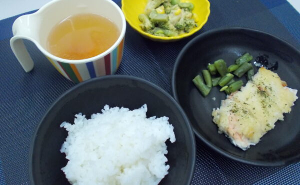 昼食 ご飯 鮭のポテト焼き ブロッコリーサラダ コンソメスープ