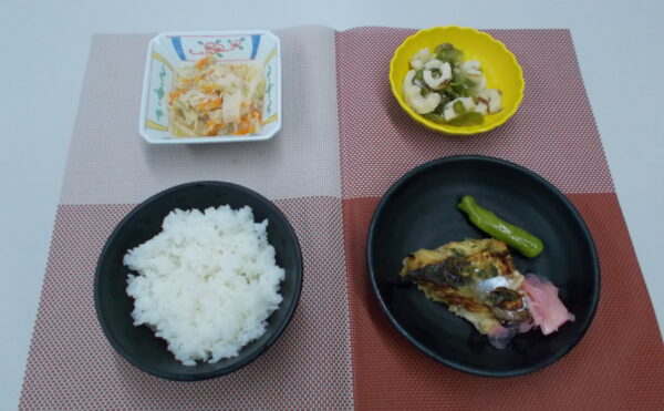 夕食 ご飯 鯖の香味焼き ちくわとピーマンの炒め物 キャベツの和え物
