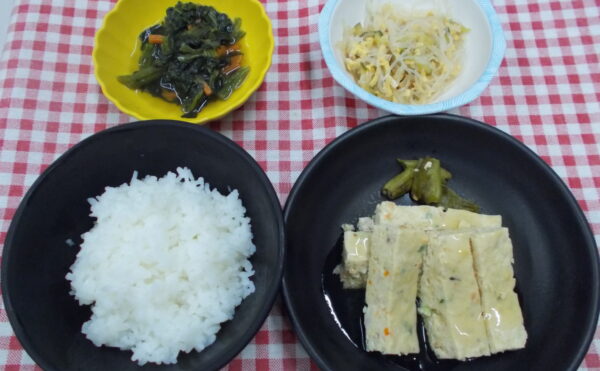 夕食 ご飯 ぎせい豆腐 ほうれん草の煮浸し 春雨の和え物