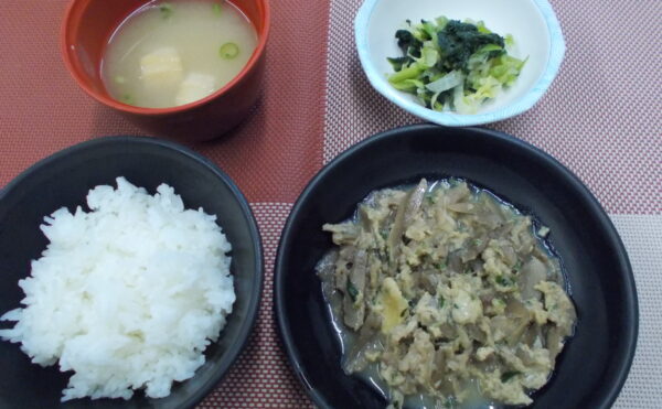 昼食 ご飯 牛肉の柳川風 二色和え みそ汁(麩・ねぎ)