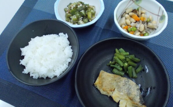 夕食 ご飯 白身魚のごま味噌焼き 五目煮 オクラの梅おかか和え