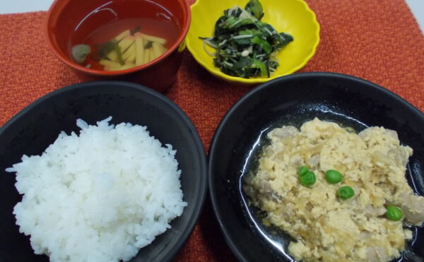 昼食 ご飯 親子煮 菜の花の和え物 清汁(かまぼこ・ねぎ)