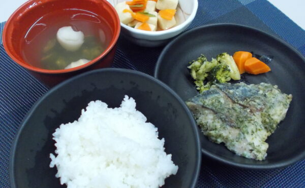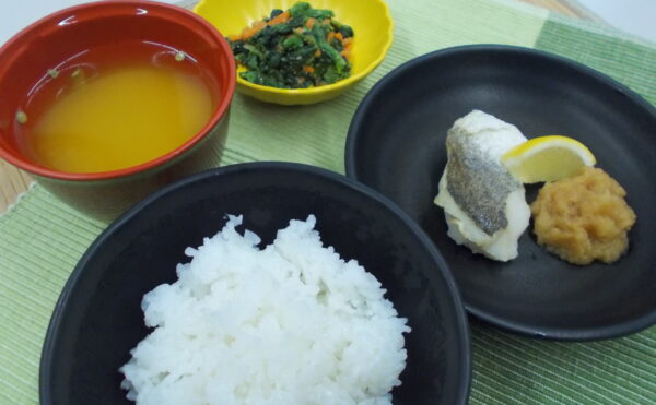 昼食 ご飯 メルルーサの塩焼き ほうれん草のごま和え みそ汁(さつま芋・きぬさや)