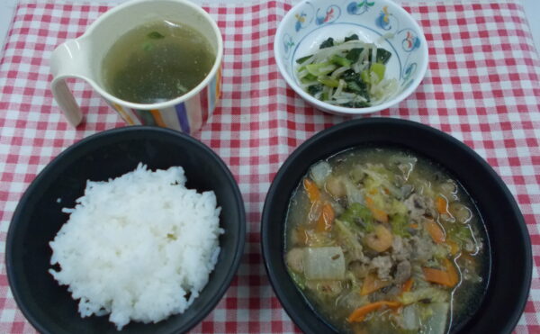 昼食 ご飯 八宝菜 もやし炒め わかめスープ