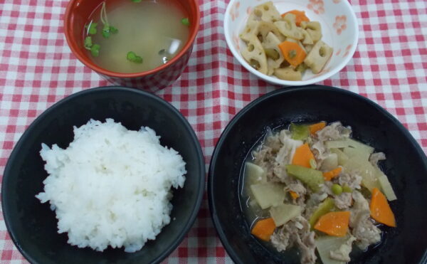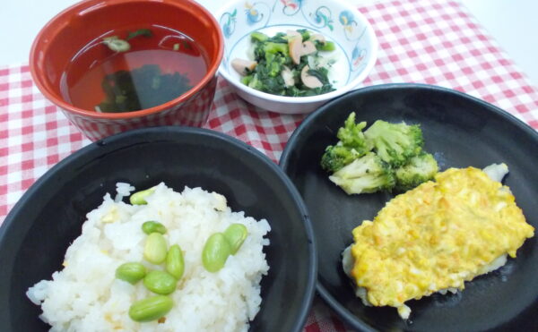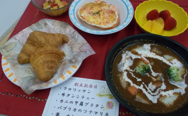 2026年3月21日昼食yorokobien 昼食 牛タンシチュー 〈特別食 創立記念日〉昼食 クロワッサン 牛タンシチュー カニの甲羅グラタン パプリカのツナマリネ フルーツ(苺・オレンジ) 〈特別食 創立記念日〉