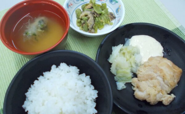 昼食 ご飯 チキン南蛮 ピーナッツ和え みそ汁(玉葱・ねぎ)