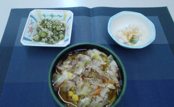 昼食 野菜ラーメン 焼売 オクラのドレッシング和え