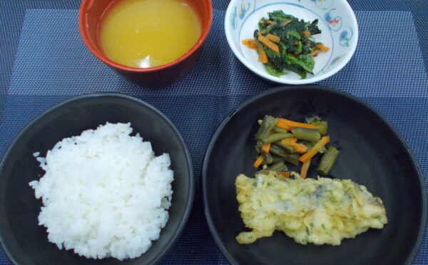 昼食 ご飯 白身魚の磯辺揚げ ほうれん草のごま和え みそ汁(南瓜・きぬさや)