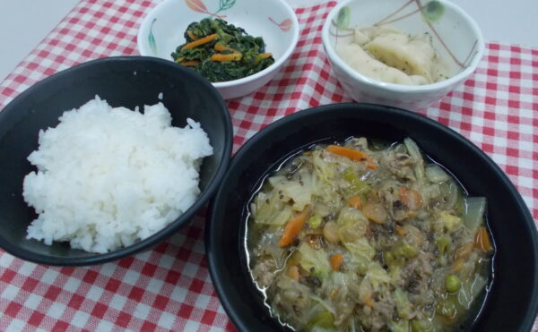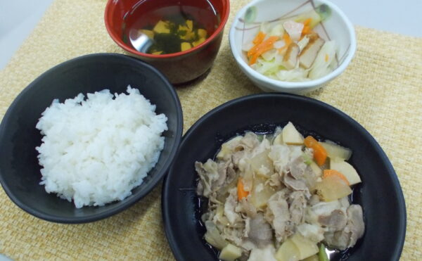 昼食 ご飯 豚肉の大和煮 キャベツの炒め煮 清汁(豆腐・三つ葉)