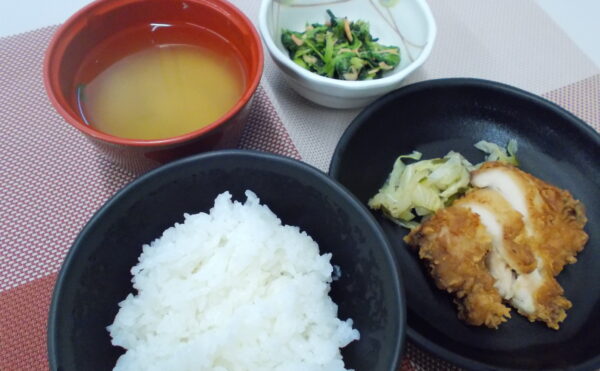 昼食 ご飯 鶏肉のから揚げ チンゲン菜のソテー みそ汁(大根・葉)