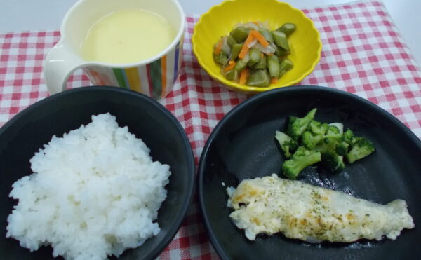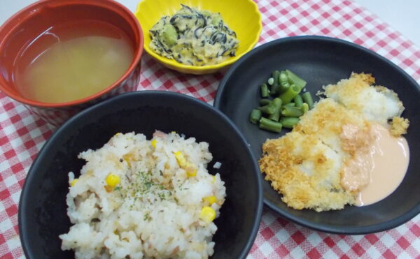 昼食 ご飯 白身魚のマヨネーズ焼き アスパラサラダ コーンスープ