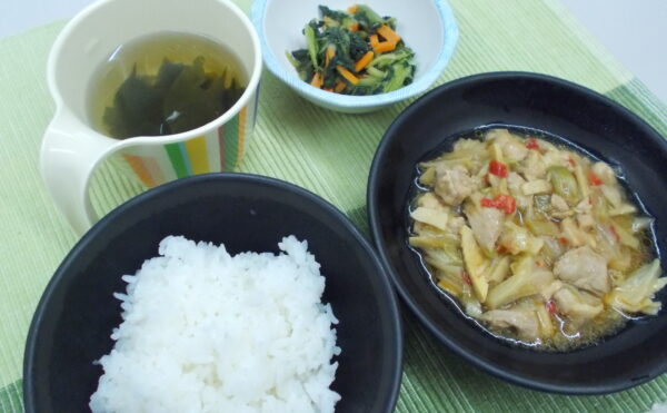 昼食 ご飯 鶏と野菜のオイスター炒め 小松菜の青じそ和え わかめスープ