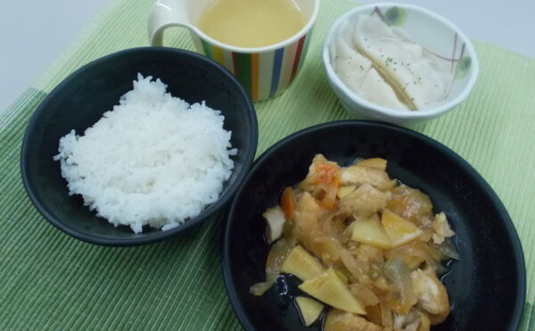 昼食 ご飯 酢鶏 水餃子 かきたまスープ
